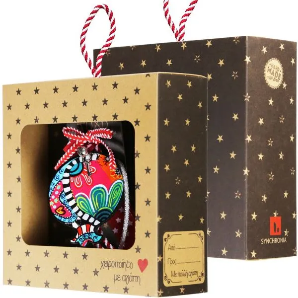 Διακοσμημένο με κορδέλες, κορδόνια και κουδουνάκια, συνοδεύεται από κομψό κουτί δώρου από ανακυκλωμένο χαρτί — ιδανικό για να το χαρίσετε με αγάπη.